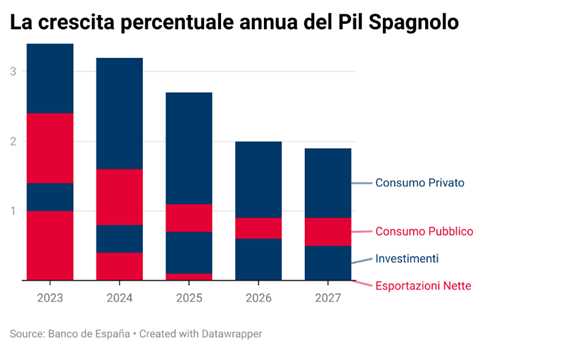 Analizzando i dati, si può osservare la crescita percentuale annua registrata dall’economia spagnola dal post Covid-19 ad oggi, oltre alla previsione dei medesimi dati fino al 2027. Questi dati mostrano come la crescita si stia attenuando dopo il forte rialzo a seguito della pandemia. Nello specifico, la crescita reale del PIL è prevista al 2,9% nel 2025 (ben più alta rispetto alla media Ue dello 0,9%), per poi moderarsi gradualmente attorno al 2% nel prossimo biennio.