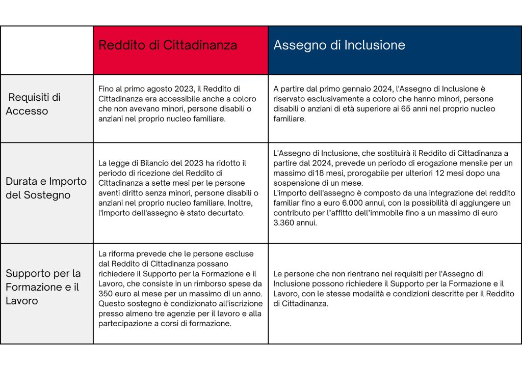 La riforma del Reddito di Cittadinanza del 2023 ha introdotto l’Assegno di Inclusione dal 2024. Quest’ultimo è riservato a famiglie con minori, disabili o anziani nel nucleo familiare, mentre il Reddito di Cittadinanza era accessibile anche senza queste condizioni fino al 2023. L’Assegno di Inclusione offre un sostegno fino a 18 mesi, con un importo annuo fino a 6.000 euro e un contributo per l’affitto fino a 3.360 euro. Entrambi forniscono supporto per la formazione e il lavoro tramite il Supporto per la Formazione e il Lavoro.