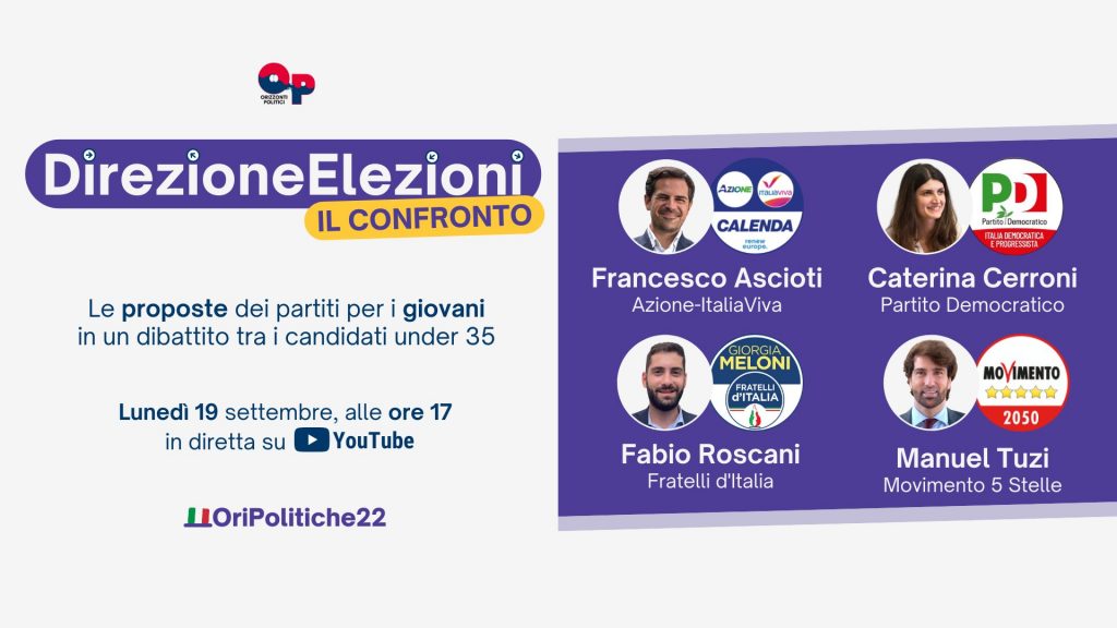 All’interno dello speciale “DirezioneElezioni” in vista del voto del 25 settembre, Orizzonti Politici ha organizzato un confronto in diretta tra 4 candidati under 35 delle 4 principali forze politiche. L’appuntamento è per lunedì 19 settembre sul canale Youtube di Orizzonti Politici e vedrà protagonisti Caterina Cerroni (Partito Democratico), Manuel Tuzi (Movimento 5 Stelle), Francesco Ascioti (Italia Viva/Azione) e Fabio Roscani (Fratelli d’Italia).