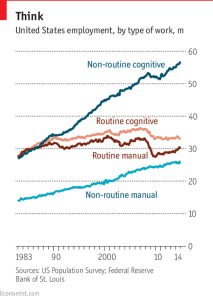 Anche se il timore di una disoccupazione di massa si è dimostrato infondato (Autor 2015 – l’occupazione è infatti ai massimi storici) è plausibile pensare che l’aumento del divario economico sia anche dovuto alla concentrazione delle tecnologie in mano a pochi gruppi economici (Alphabe t Inc., Apple Inc., Meta Platforms, Inc, etc. ) e anche alla polarizzazione dei lavori: gli occupati in lavori non di routine, sia cognitivi che manuali, sono aumentati costantemente negli ultimi anni. Al contrario, gli occupati in lavori di routine sono rimasti in gran parte costanti, riducendo quindi il peso percentuale della “classe media”, di cui tali lavoratori costituivano la fetta più importante.