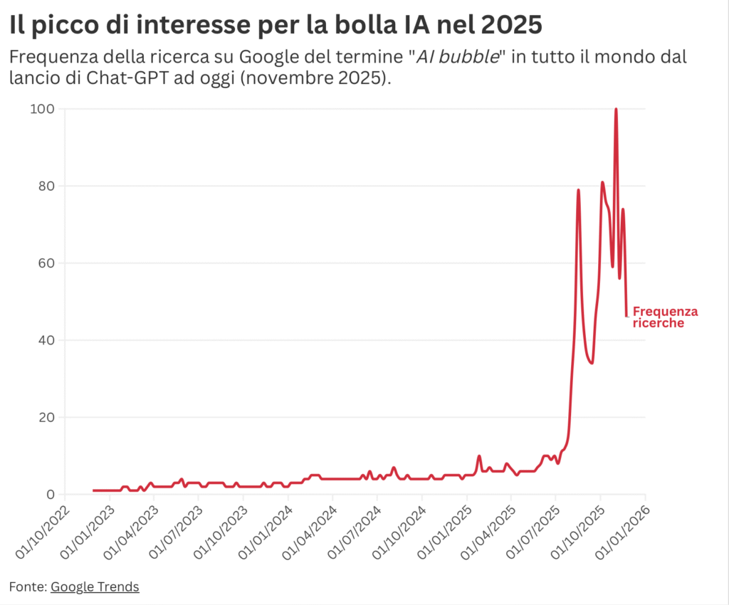 Si tratta di un difficile equilibrio da mantenere in cui gli investitori si rincorrono per non “rimanere indietro”, ma senza sapere se i propri investimenti saranno effettivamente ripagati. Già nel maggio 2023 qualcuno parlava di bolla speculativa dell’IA, il picco di interesse è chiaramente nel 2025.