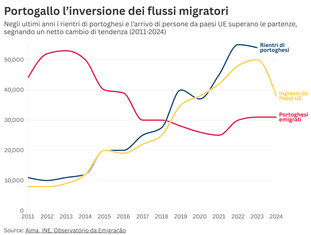 Il Portogallo, a lungo Paese di forte emigrazione giovanile, negli ultimi anni ha cambiato segno alla propria dinamica migratoria complessiva, passando da un’economia che esportava giovani a un sistema capace di attrarre nuova popolazione in età lavorativa. Questo cambiamento è dovuto in larga misura all’arrivo di giovani stranieri, ma anche al rallentamento dell’emigrazione dei giovani portoghesi e alla creazione di condizioni più favorevoli al rientro. Fino a qualche anno fa, ogni anno decine di migliaia di giovani portoghesi tra i 20 e i 35 anni lasciavano il Paese, spinti da salari bassi, costi abitativi elevati e tassazione non competitiva, in un contesto di crisi economica post-2008 che aveva accentuato la fuga di cervelli.