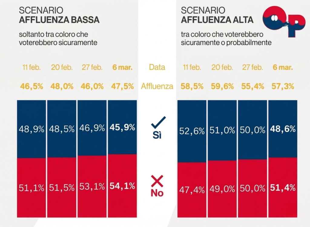 Significativo è il cambio di passo della premier Meloni: inizialmente aveva cercato di tenere la riforma lontana dalla dimensione partitica, ma — complici forse i sondaggi che vedrebbero prevalere il No — ha scelto di scendere in campo personalmente, puntando su un’affluenza più alta per ribaltare il risultato. Un’analisi di YouTrend, del resto, indica proprio nell’alta partecipazione la chiave per una possibile vittoria del Sì.