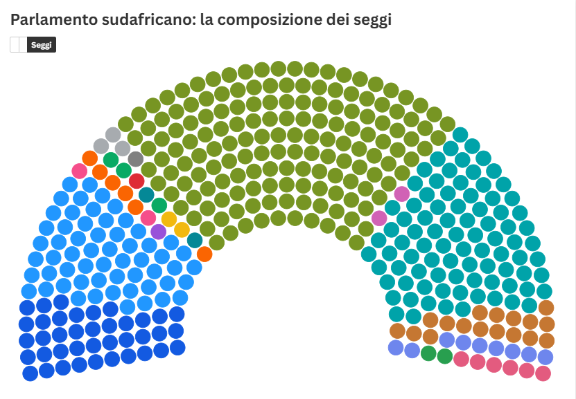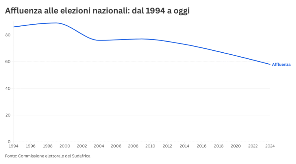 È una percentuale molto alta, ma che ha comunque costretto il partito a negoziare un governo di coalizione. Quello attualmente in carica è il secondo governo di coalizione della storia del Sudafrica indipendente. Ma c’è una differenza sostanziale col precedente. Nel 1994, Mandela varò un governo di coalizione non per necessità numeriche – l’ANC ottenne da solo il 62% – ma per riscrivere la Costituzione e riappacificare le forze politiche del paese.