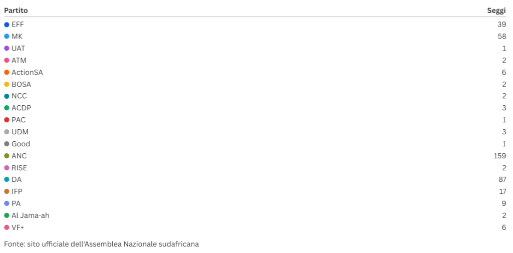 Quelle del 2024 sono state elezioni storiche: per la prima volta, l’ANC non ha ottenuto la maggioranza assoluta. Nonostante questo, il suo attuale leader di partito, Cyril Ramaphosa, si è imposto come capo del governo, posizione che occupa dal 2018. Il partito ha infatti mantenuto la maggioranza relativa, col 40,2% dei voti.